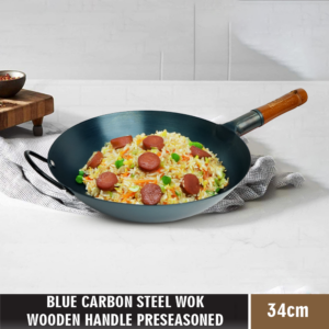 Blue Carbon Steel Wok Wooden Handle Pre-seasoned 34cm
