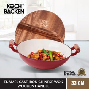 High Glossy Enamel Cast Iron Wok Flat Bottom With Wooden Handle 33cm