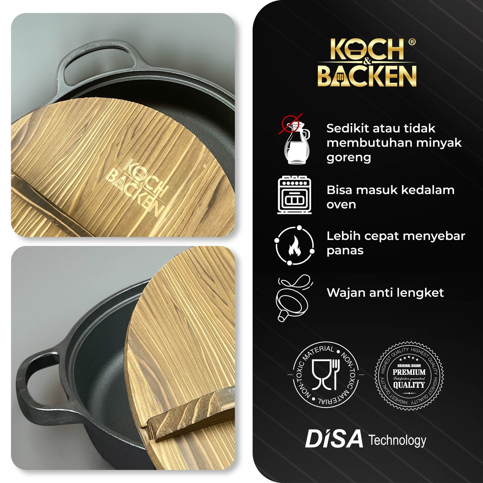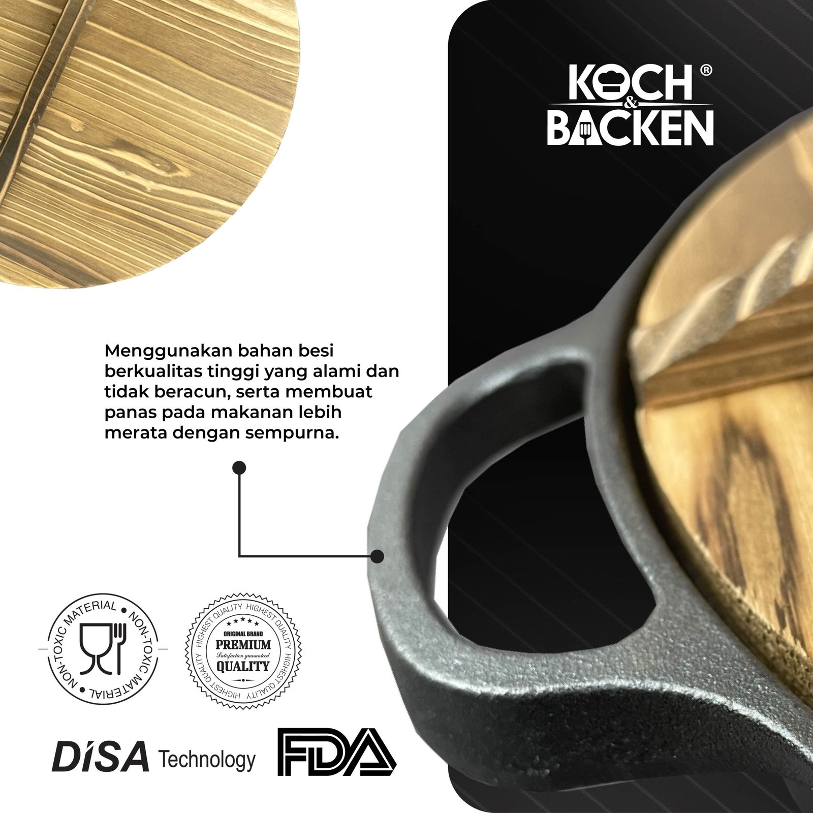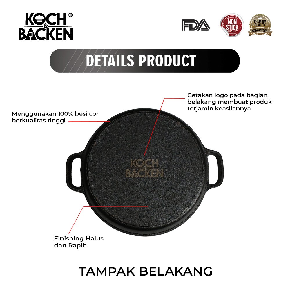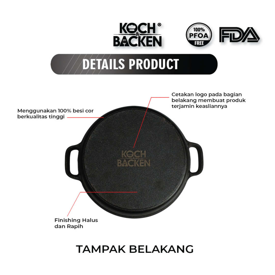 - Lapisan anti lengket cast iron terbentuk dari minyak yang alami / minyak nabati sehingga aman bagi tubuh.