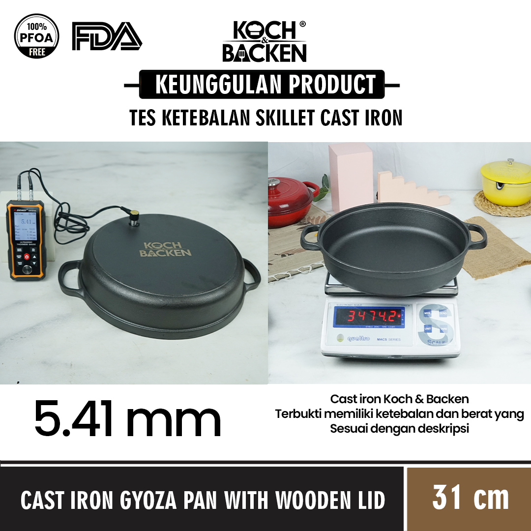 Terbuat dari 100% premium cast iron, aman digunakan sehari-hari. Cast Iron Gyoza Pan berbahan dasar cast iron dengan penghantar panas terbaik (panas merata) sangat baik digunakan untuk membuat masakan berkuah , menggoreng, membakar maupun sebagai loyang untuk memasak kue. Cast Iron Gyoza Pan ini juga dilengkapi dengan tutup kayu premium yang memiliki tekture yang baik.