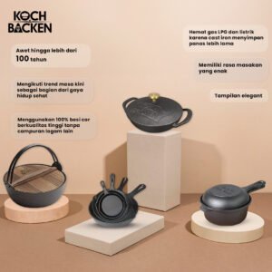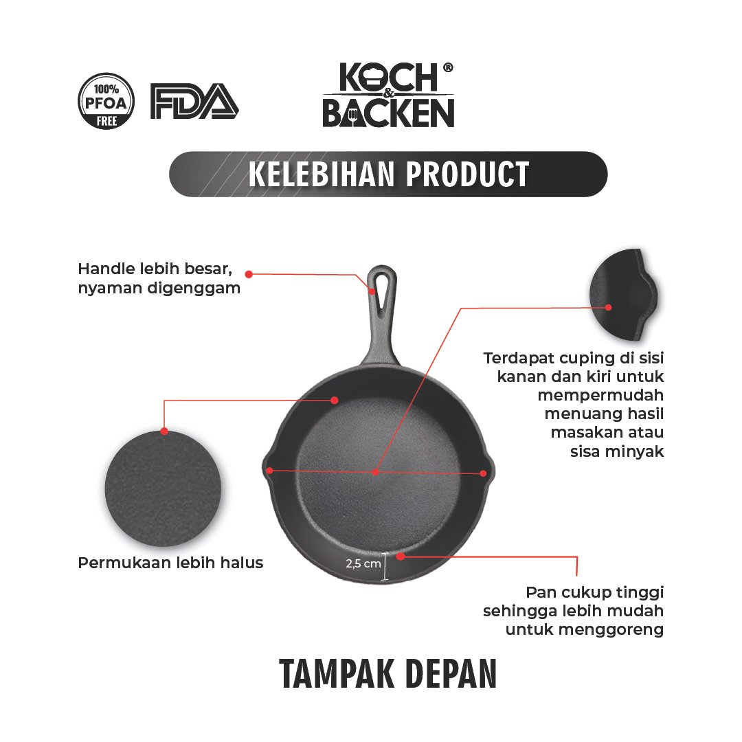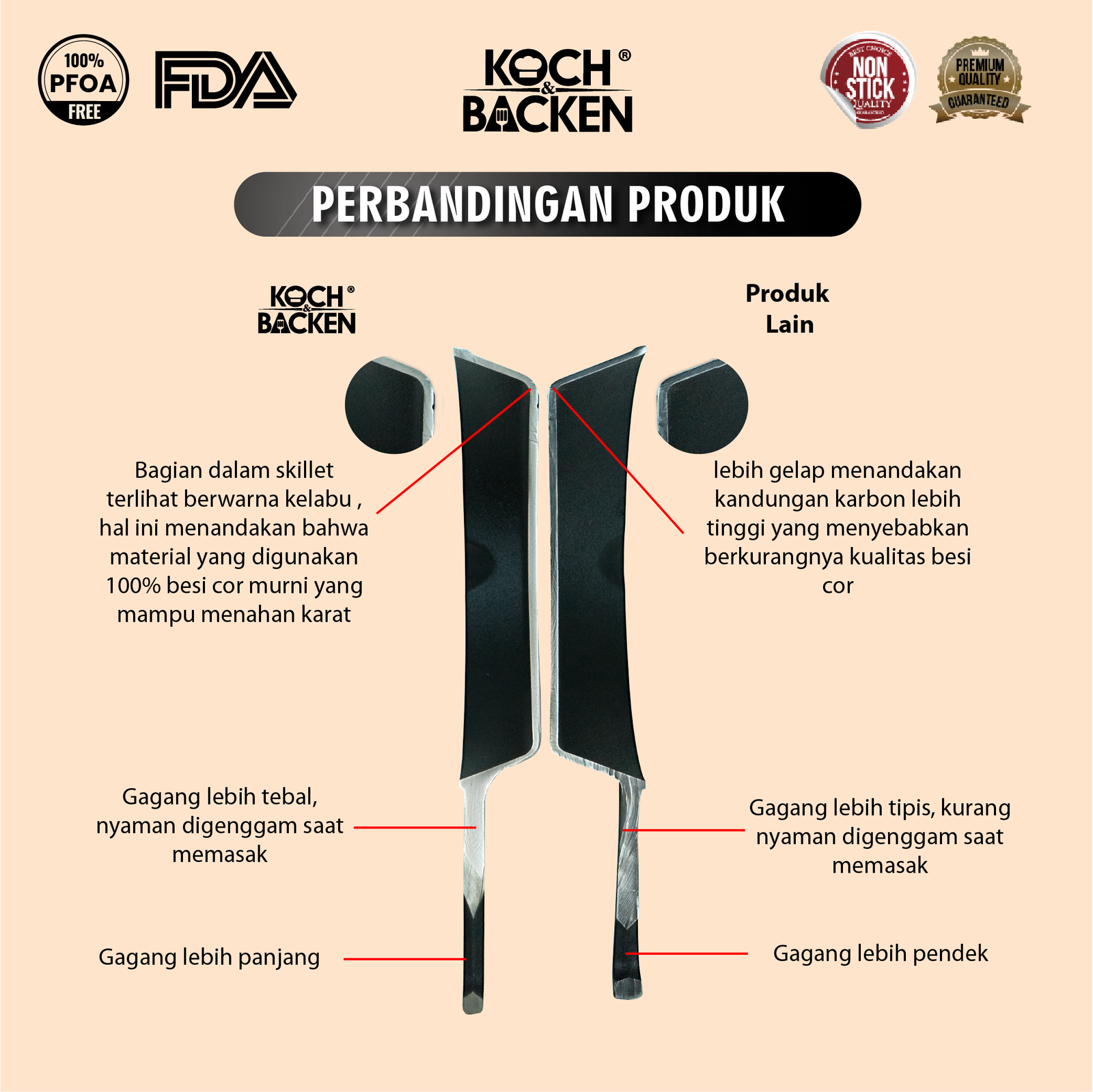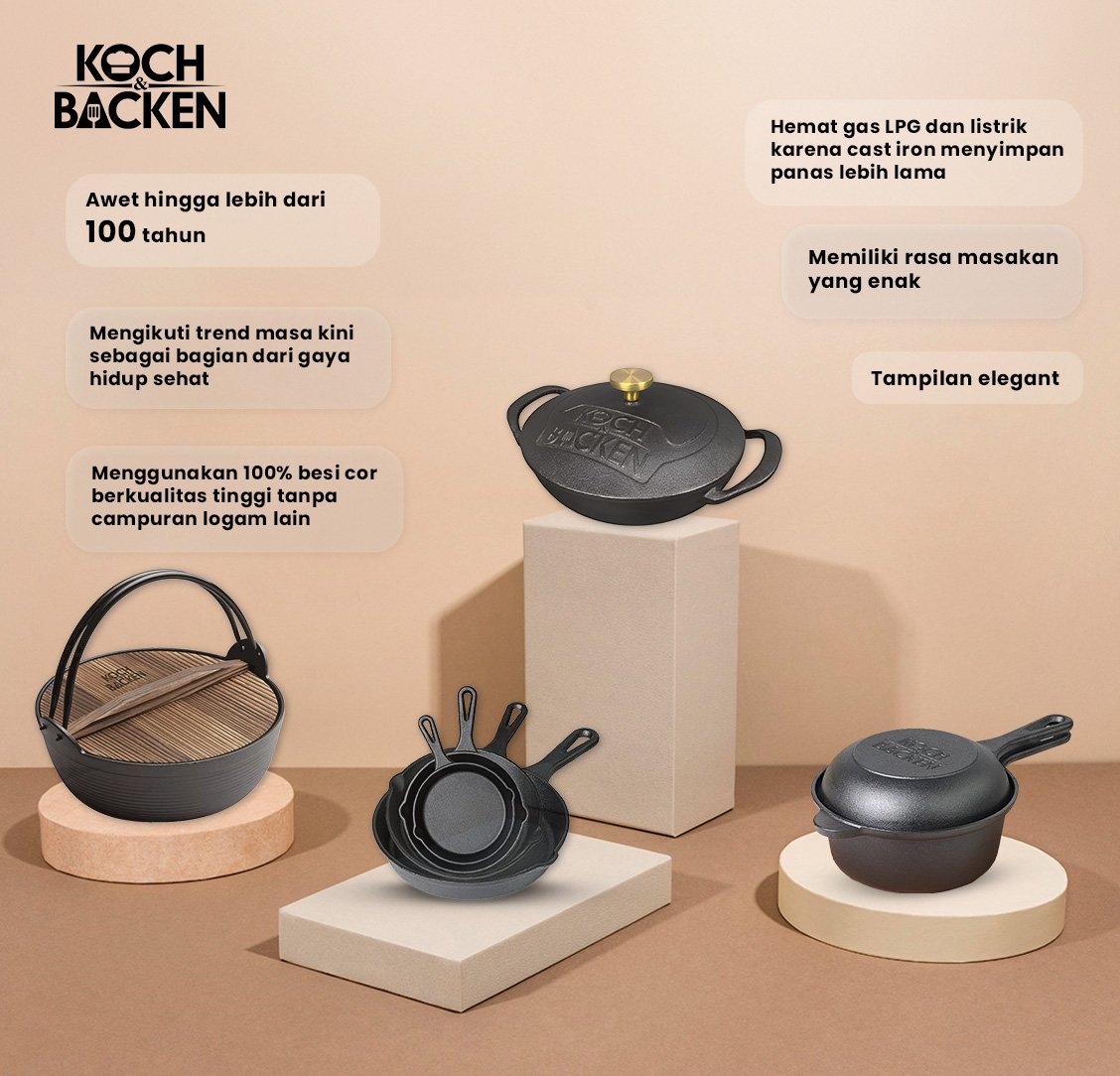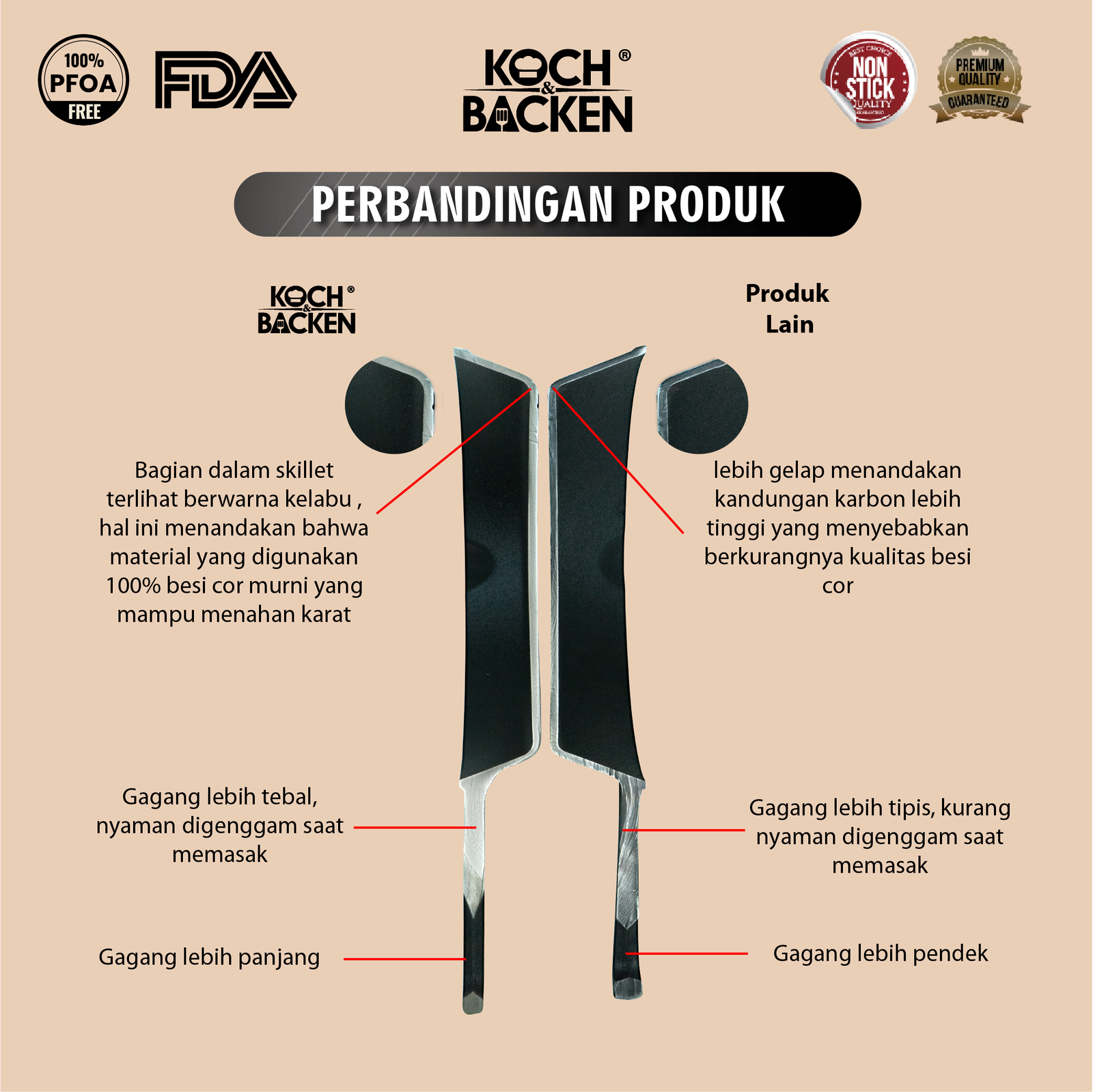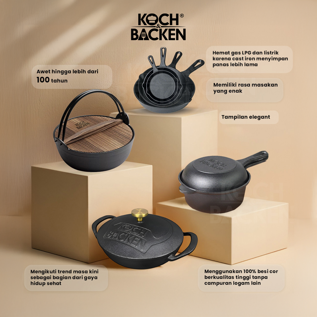 Semua Produk Koch & Backen Cast Iron Cookware dibuat dgn Cor Mesin Digital Disa Technology, menjamin bentuk yg presisi dan rapi serta ketebalan yg sama, menghasilkan penyebaran panas yg merata. Murni Besi Cor tanpa lapisan dan tebal sehingga masakan cepat matang dengan sempurna dan dapat menahan/menyimpan panas lebih lama.