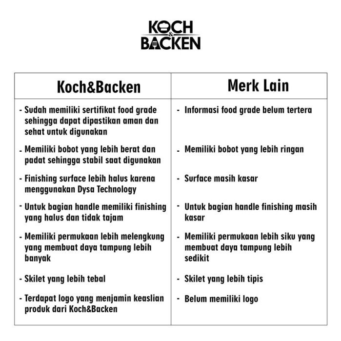 Koch & Backen hadir untuk memberikan kemudahan dalam menyediakan berbagai macam produk keperluan rumah tangga keluarga Indonesia dengan kualitas nomor satu dan terbaik tetapi dengan harga yang sangat terjangkau. Impian terbesar kami dapat melihat produk Koch & Backen ada disetiap rumah keluarga Indonesia.