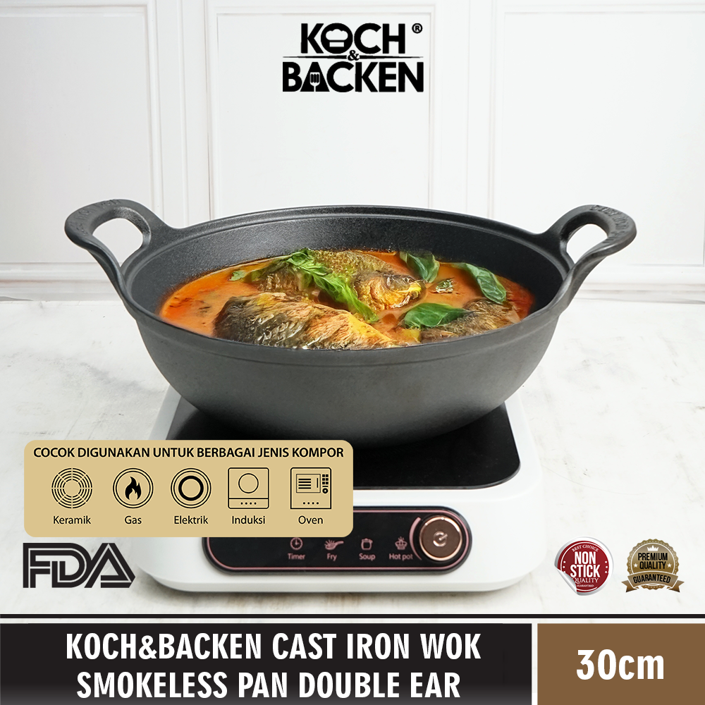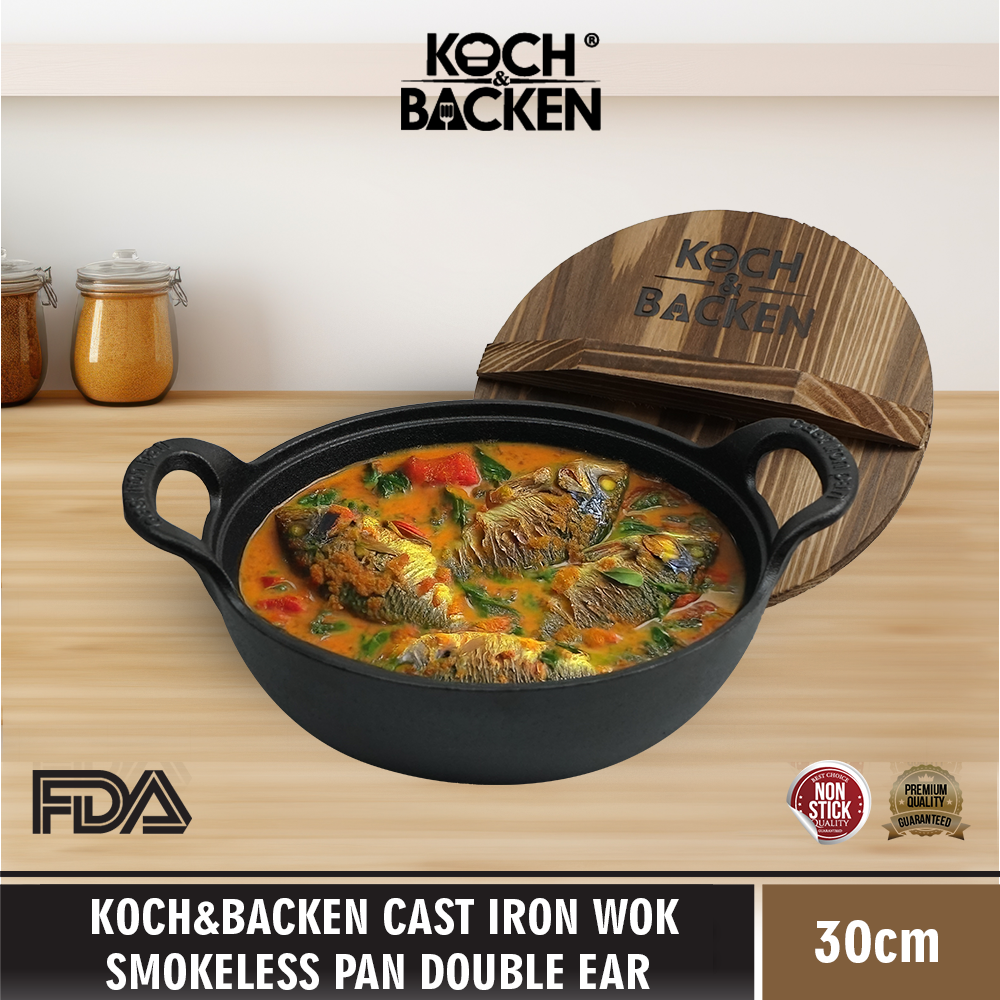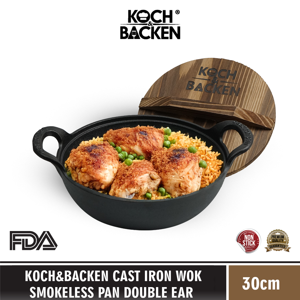 KOCH&BACKEN Cast Iron Wok Smokeless Pan Double Ear With Wooden Lid 30cm