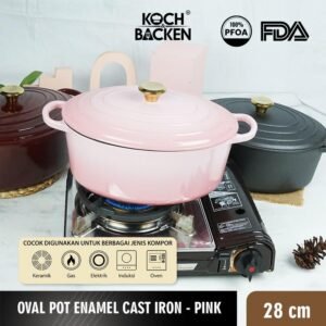 Enamel oval pot ini di design sedemikian rupa sebagai alat masak anti lengket dengan tampilan yang elegant. Untuk lapisan dalam di design menggunakan full enamel dimana tampilan lebih cantik dan tidak mudah kotor. Dengan bentuk oval serta knob berwarna gold menjadikan enamel pot ini terlihat mewah.