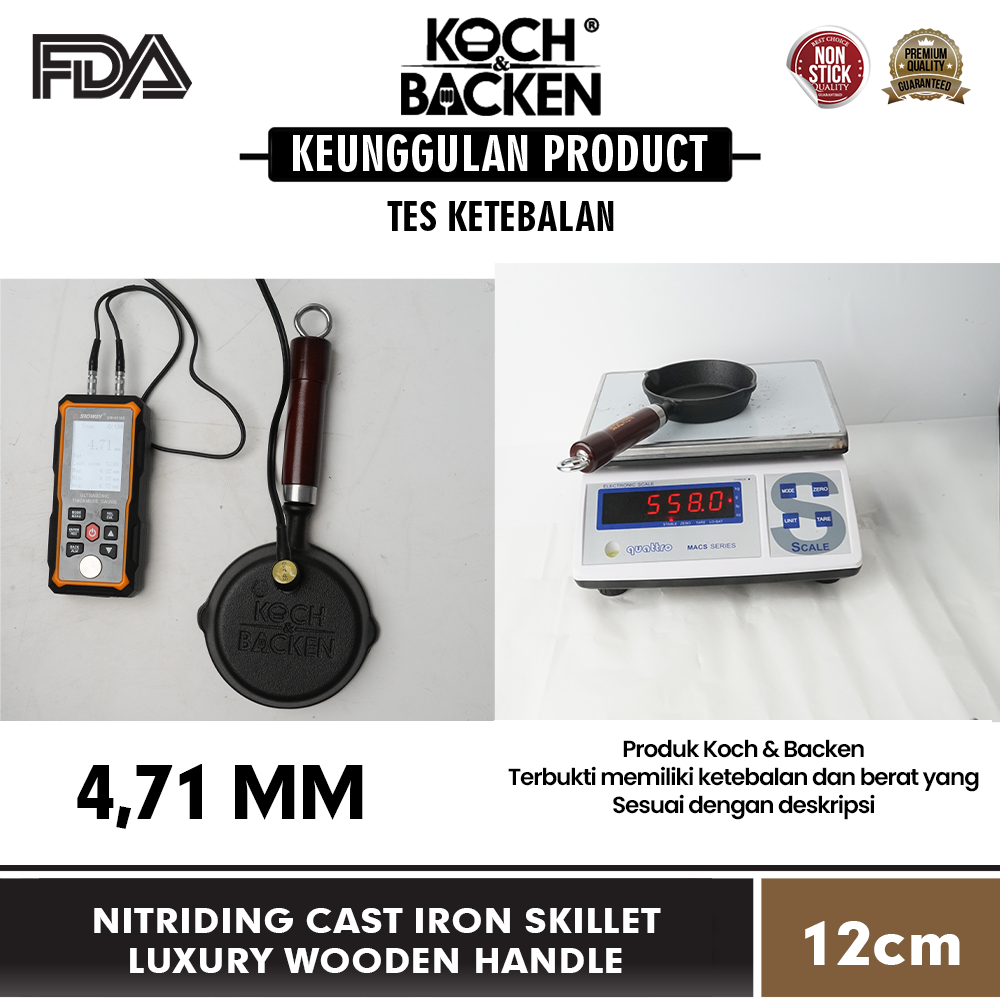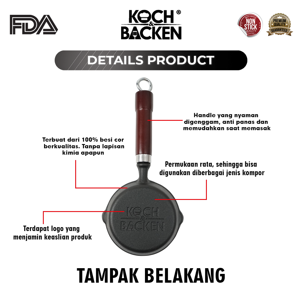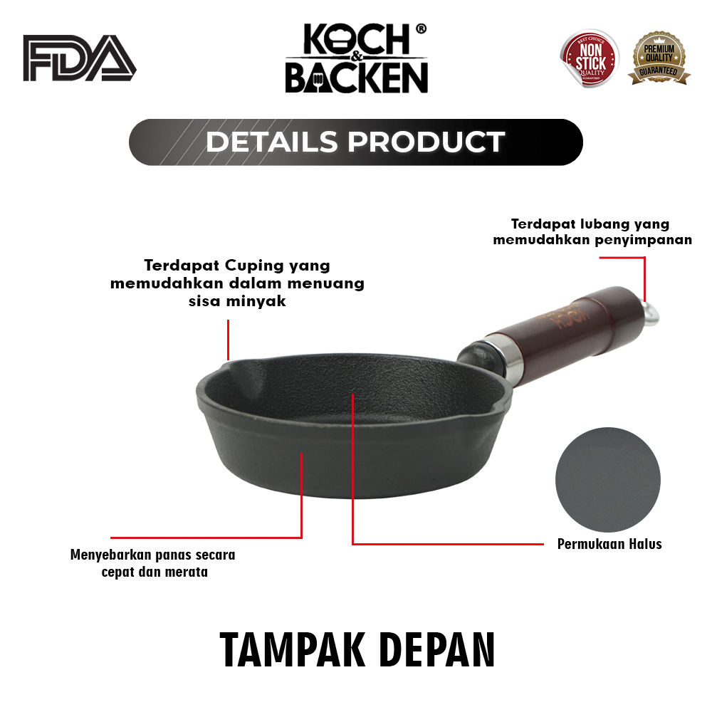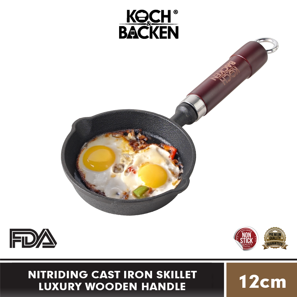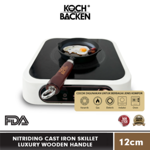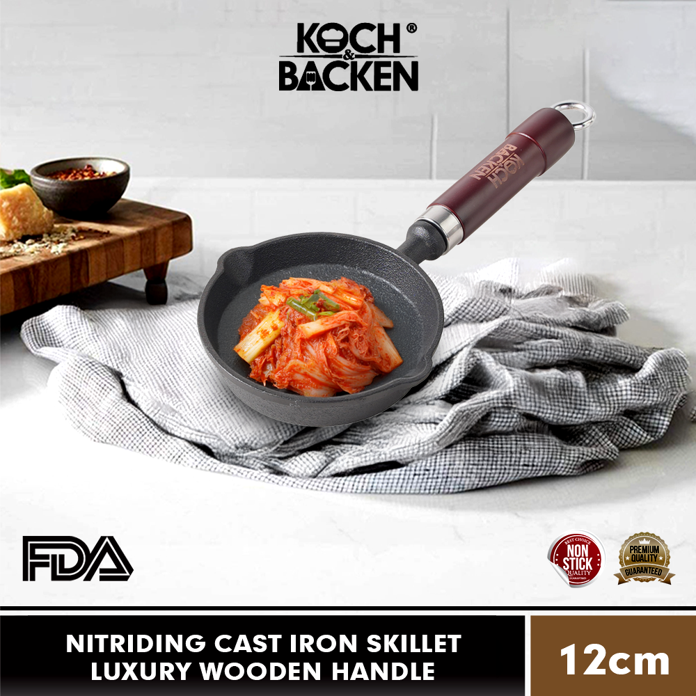 KOCH&BACKEN Nitriding Cast Iron Skillet Luxury Wooden Handle 12cm – Wajan Panci Gagang Kayu Anti Lengket Besi Cor Murni