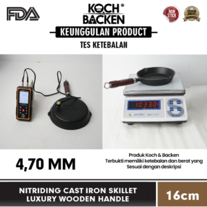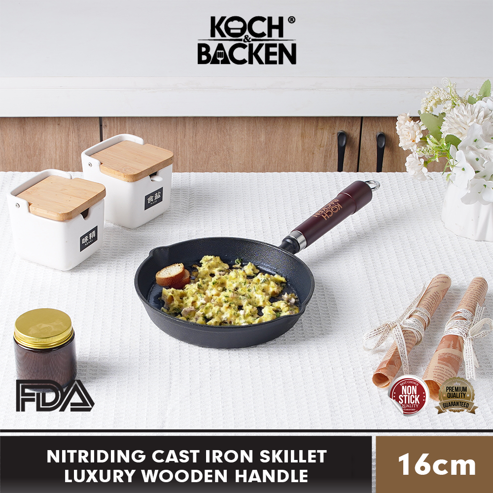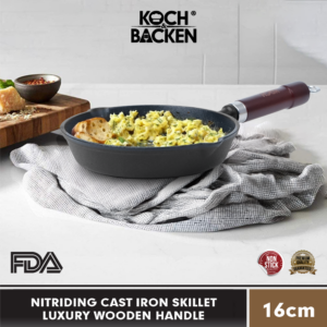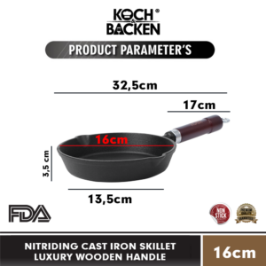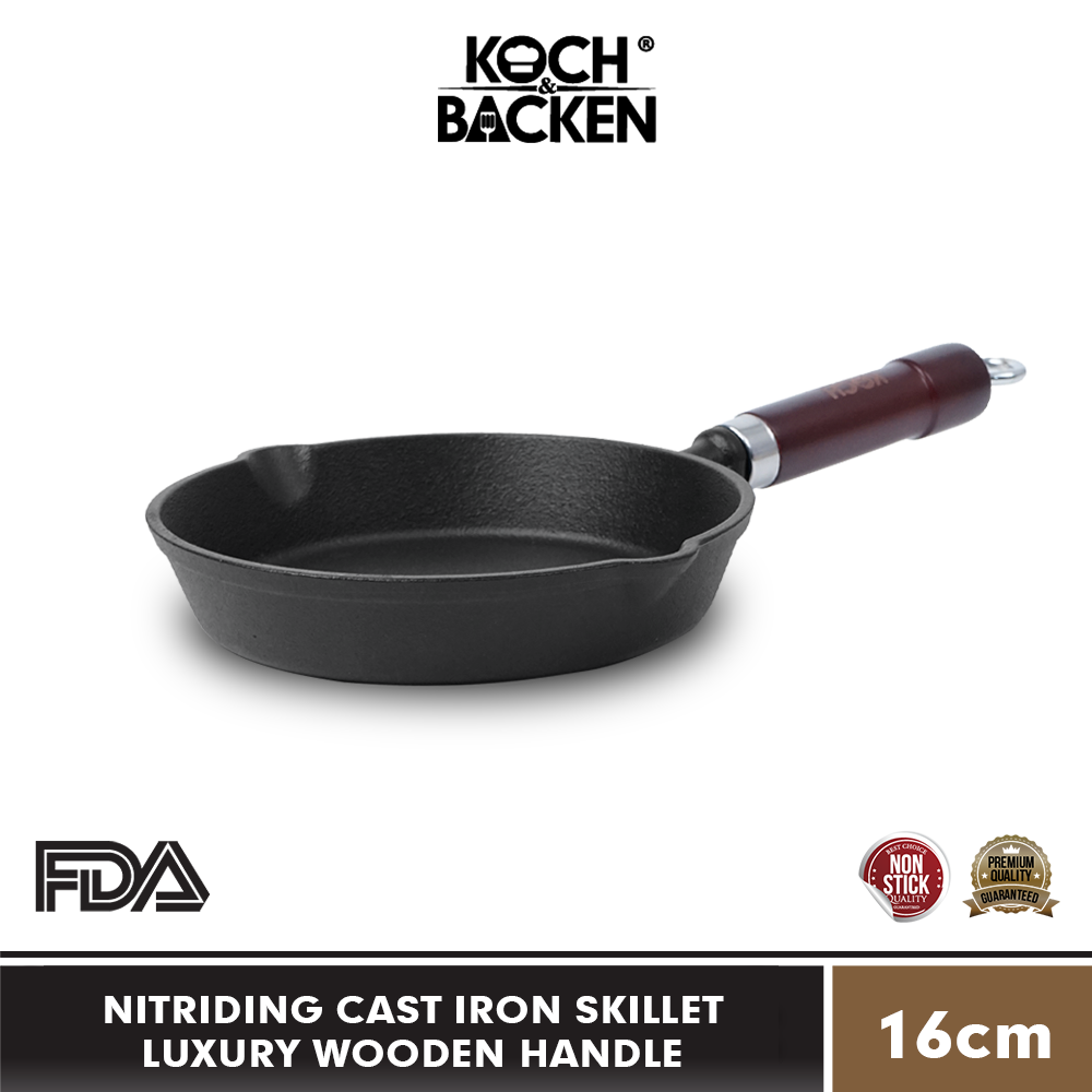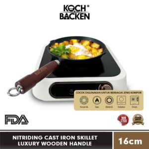 KOCH&BACKEN Nitriding Cast Iron Skillet Luxury Wooden Handle 16cm – Wajan Panci Gagang Kayu Anti Lengket Besi Cor Murni