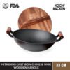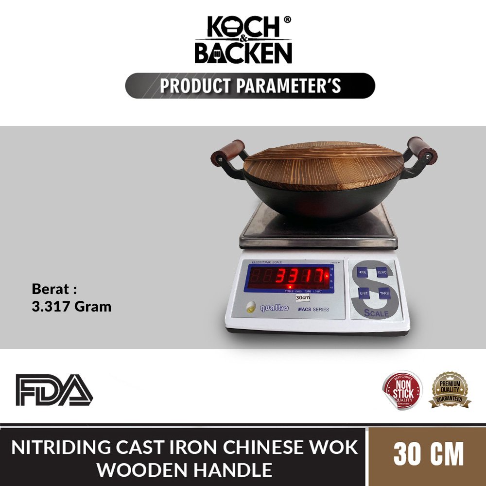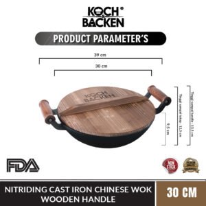KOCH&BACKEN Nitriding Pre-seasoned Cast Iron Wok Flat Bottom with Wooden Handle and Lid 30cm